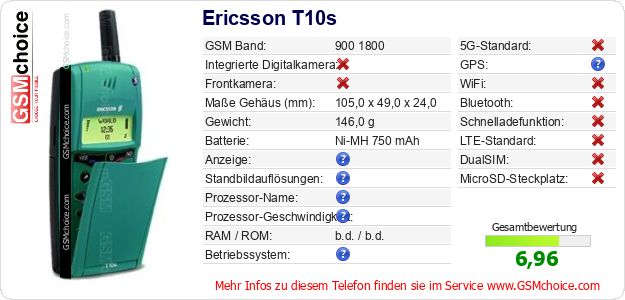 Hast du eigene Webseite? Willst du die Informationen über Standarddaten des Handys Ericsson T10s irgendwo veröffentlichen? Das ist sehr einfach. Du kannst das Bild herunterladen oder kopieren und auf der Webseite folgenden Code hinzufügen:Das Einfügen von diesem Code verursacht das Anzeigen von dem folgenden Bild: