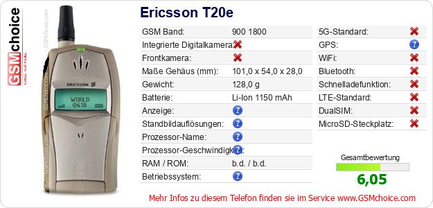 Hast du eigene Webseite? Willst du die Informationen über Standarddaten des Handys Ericsson T20e irgendwo veröffentlichen? Das ist sehr einfach. Du kannst das Bild herunterladen oder kopieren und auf der Webseite folgenden Code hinzufügen:Das Einfügen von diesem Code verursacht das Anzeigen von dem folgenden Bild: