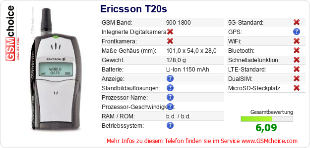 Hast du eigene Webseite? Willst du die Informationen über Standarddaten des Handys Ericsson T20s irgendwo veröffentlichen? Das ist sehr einfach. Du kannst das Bild herunterladen oder kopieren und auf der Webseite folgenden Code hinzufügen:Das Einfügen von diesem Code verursacht das Anzeigen von dem folgenden Bild: