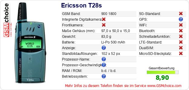 Hast du eigene Webseite? Willst du die Informationen über Standarddaten des Handys Ericsson T28s irgendwo veröffentlichen? Das ist sehr einfach. Du kannst das Bild herunterladen oder kopieren und auf der Webseite folgenden Code hinzufügen:Das Einfügen von diesem Code verursacht das Anzeigen von dem folgenden Bild: