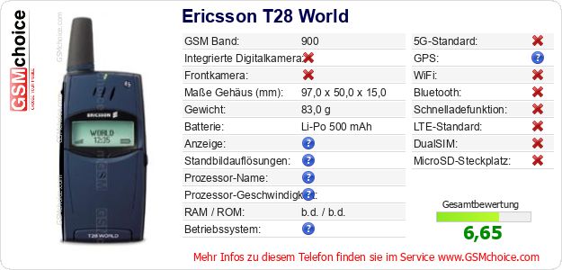 Hast du eigene Webseite? Willst du die Informationen über Standarddaten des Handys Ericsson T28 World irgendwo veröffentlichen? Das ist sehr einfach. Du kannst das Bild herunterladen oder kopieren und auf der Webseite folgenden Code hinzufügen:Das Einfügen von diesem Code verursacht das Anzeigen von dem folgenden Bild: