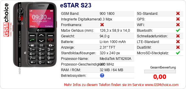 Hast du eigene Webseite? Willst du die Informationen über Standarddaten des Handys eSTAR S23 irgendwo veröffentlichen? Das ist sehr einfach. Du kannst das Bild herunterladen oder kopieren und auf der Webseite folgenden Code hinzufügen:Das Einfügen von diesem Code verursacht das Anzeigen von dem folgenden Bild: