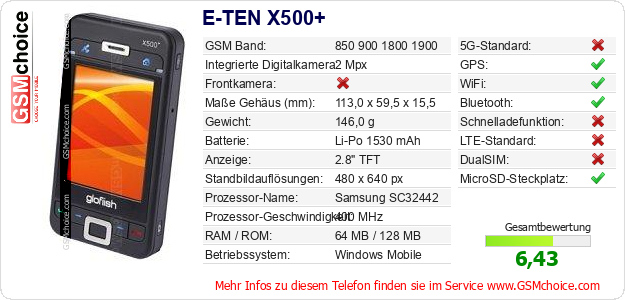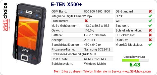 Hast du eigene Webseite? Willst du die Informationen über Standarddaten des Handys E-TEN X500+ irgendwo veröffentlichen? Das ist sehr einfach. Du kannst das Bild herunterladen oder kopieren und auf der Webseite folgenden Code hinzufügen:Das Einfügen von diesem Code verursacht das Anzeigen von dem folgenden Bild: