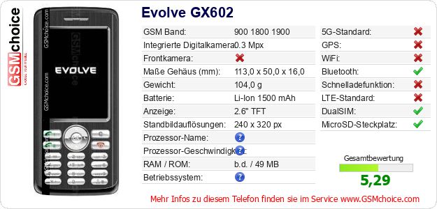 Hast du eigene Webseite? Willst du die Informationen über Standarddaten des Handys Evolve GX602 irgendwo veröffentlichen? Das ist sehr einfach. Du kannst das Bild herunterladen oder kopieren und auf der Webseite folgenden Code hinzufügen:Das Einfügen von diesem Code verursacht das Anzeigen von dem folgenden Bild: