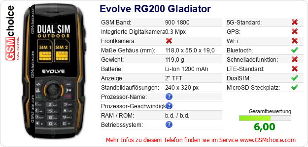 Daten des Mobiltelefons Evolve RG200 Gladiator auf Ihrer Seite