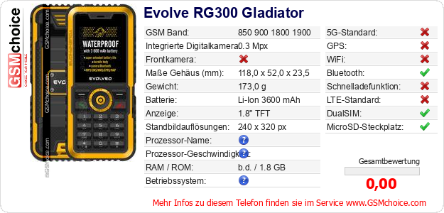 Hast du eigene Webseite? Willst du die Informationen über Standarddaten des Handys Evolve RG300 Gladiator irgendwo veröffentlichen? Das ist sehr einfach. Du kannst das Bild herunterladen oder kopieren und auf der Webseite folgenden Code hinzufügen:Das Einfügen von diesem Code verursacht das Anzeigen von dem folgenden Bild: