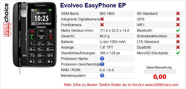 Hast du eigene Webseite? Willst du die Informationen über Standarddaten des Handys Evolveo EasyPhone EP irgendwo veröffentlichen? Das ist sehr einfach. Du kannst das Bild herunterladen oder kopieren und auf der Webseite folgenden Code hinzufügen:Das Einfügen von diesem Code verursacht das Anzeigen von dem folgenden Bild:
