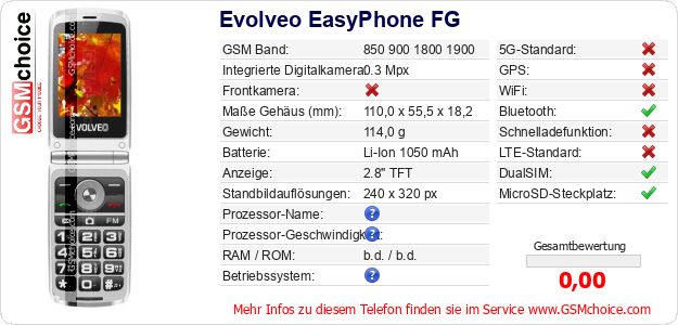 Hast du eigene Webseite? Willst du die Informationen über Standarddaten des Handys Evolveo EasyPhone FG irgendwo veröffentlichen? Das ist sehr einfach. Du kannst das Bild herunterladen oder kopieren und auf der Webseite folgenden Code hinzufügen:Das Einfügen von diesem Code verursacht das Anzeigen von dem folgenden Bild: