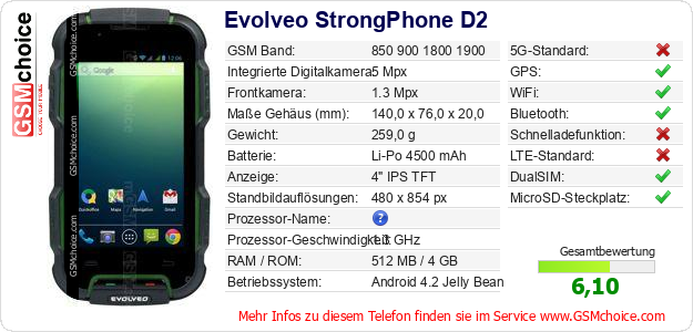 Hast du eigene Webseite? Willst du die Informationen über Standarddaten des Handys Evolveo StrongPhone D2 irgendwo veröffentlichen? Das ist sehr einfach. Du kannst das Bild herunterladen oder kopieren und auf der Webseite folgenden Code hinzufügen:Das Einfügen von diesem Code verursacht das Anzeigen von dem folgenden Bild: