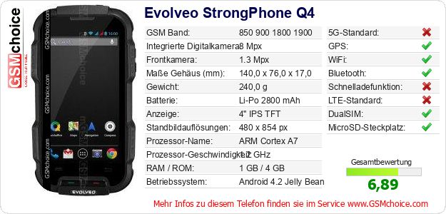 Hast du eigene Webseite? Willst du die Informationen über Standarddaten des Handys Evolveo StrongPhone Q4 irgendwo veröffentlichen? Das ist sehr einfach. Du kannst das Bild herunterladen oder kopieren und auf der Webseite folgenden Code hinzufügen:Das Einfügen von diesem Code verursacht das Anzeigen von dem folgenden Bild: