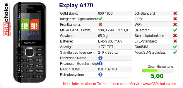 Hast du eigene Webseite? Willst du die Informationen über Standarddaten des Handys Explay A170 irgendwo veröffentlichen? Das ist sehr einfach. Du kannst das Bild herunterladen oder kopieren und auf der Webseite folgenden Code hinzufügen:Das Einfügen von diesem Code verursacht das Anzeigen von dem folgenden Bild: