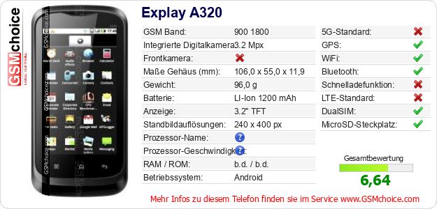 Hast du eigene Webseite? Willst du die Informationen über Standarddaten des Handys Explay A320 irgendwo veröffentlichen? Das ist sehr einfach. Du kannst das Bild herunterladen oder kopieren und auf der Webseite folgenden Code hinzufügen:Das Einfügen von diesem Code verursacht das Anzeigen von dem folgenden Bild:
