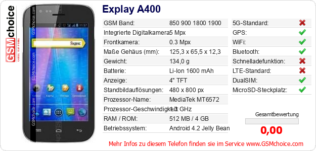 Hast du eigene Webseite? Willst du die Informationen über Standarddaten des Handys Explay A400 irgendwo veröffentlichen? Das ist sehr einfach. Du kannst das Bild herunterladen oder kopieren und auf der Webseite folgenden Code hinzufügen:Das Einfügen von diesem Code verursacht das Anzeigen von dem folgenden Bild: