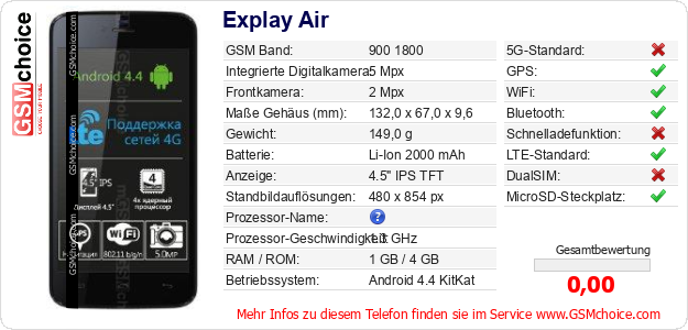 Hast du eigene Webseite? Willst du die Informationen über Standarddaten des Handys Explay Air irgendwo veröffentlichen? Das ist sehr einfach. Du kannst das Bild herunterladen oder kopieren und auf der Webseite folgenden Code hinzufügen:Das Einfügen von diesem Code verursacht das Anzeigen von dem folgenden Bild:
