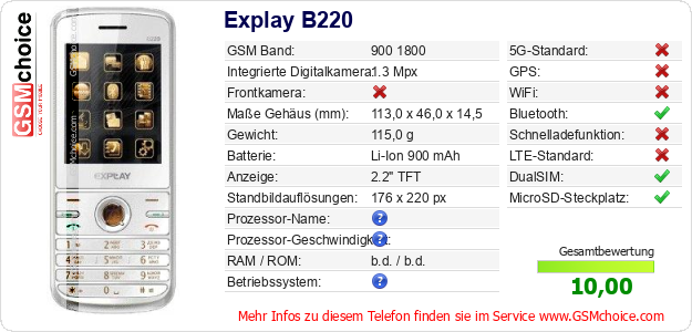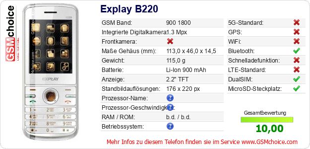 Hast du eigene Webseite? Willst du die Informationen über Standarddaten des Handys Explay B220 irgendwo veröffentlichen? Das ist sehr einfach. Du kannst das Bild herunterladen oder kopieren und auf der Webseite folgenden Code hinzufügen:Das Einfügen von diesem Code verursacht das Anzeigen von dem folgenden Bild: