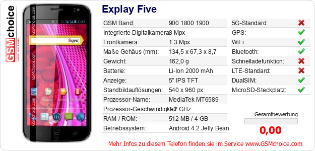 Hast du eigene Webseite? Willst du die Informationen über Standarddaten des Handys Explay Five irgendwo veröffentlichen? Das ist sehr einfach. Du kannst das Bild herunterladen oder kopieren und auf der Webseite folgenden Code hinzufügen:Das Einfügen von diesem Code verursacht das Anzeigen von dem folgenden Bild: