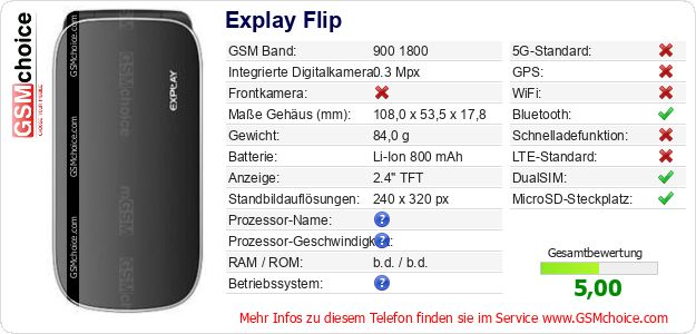 Hast du eigene Webseite? Willst du die Informationen über Standarddaten des Handys Explay Flip irgendwo veröffentlichen? Das ist sehr einfach. Du kannst das Bild herunterladen oder kopieren und auf der Webseite folgenden Code hinzufügen:Das Einfügen von diesem Code verursacht das Anzeigen von dem folgenden Bild: