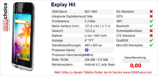 Hast du eigene Webseite? Willst du die Informationen über Standarddaten des Handys Explay Hit irgendwo veröffentlichen? Das ist sehr einfach. Du kannst das Bild herunterladen oder kopieren und auf der Webseite folgenden Code hinzufügen:Das Einfügen von diesem Code verursacht das Anzeigen von dem folgenden Bild: