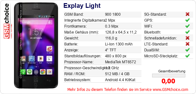 Hast du eigene Webseite? Willst du die Informationen über Standarddaten des Handys Explay Light irgendwo veröffentlichen? Das ist sehr einfach. Du kannst das Bild herunterladen oder kopieren und auf der Webseite folgenden Code hinzufügen:Das Einfügen von diesem Code verursacht das Anzeigen von dem folgenden Bild: