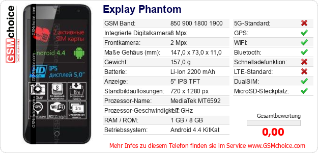 Hast du eigene Webseite? Willst du die Informationen über Standarddaten des Handys Explay Phantom irgendwo veröffentlichen? Das ist sehr einfach. Du kannst das Bild herunterladen oder kopieren und auf der Webseite folgenden Code hinzufügen:Das Einfügen von diesem Code verursacht das Anzeigen von dem folgenden Bild: