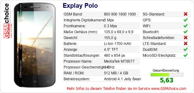 Hast du eigene Webseite? Willst du die Informationen über Standarddaten des Handys Explay Polo irgendwo veröffentlichen? Das ist sehr einfach. Du kannst das Bild herunterladen oder kopieren und auf der Webseite folgenden Code hinzufügen:Das Einfügen von diesem Code verursacht das Anzeigen von dem folgenden Bild: