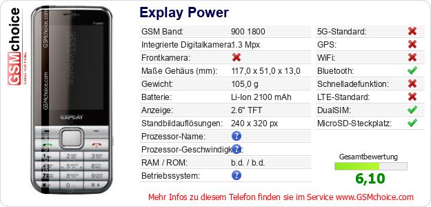 Hast du eigene Webseite? Willst du die Informationen über Standarddaten des Handys Explay Power irgendwo veröffentlichen? Das ist sehr einfach. Du kannst das Bild herunterladen oder kopieren und auf der Webseite folgenden Code hinzufügen:Das Einfügen von diesem Code verursacht das Anzeigen von dem folgenden Bild: