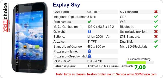 Hast du eigene Webseite? Willst du die Informationen über Standarddaten des Handys Explay Sky irgendwo veröffentlichen? Das ist sehr einfach. Du kannst das Bild herunterladen oder kopieren und auf der Webseite folgenden Code hinzufügen:Das Einfügen von diesem Code verursacht das Anzeigen von dem folgenden Bild: