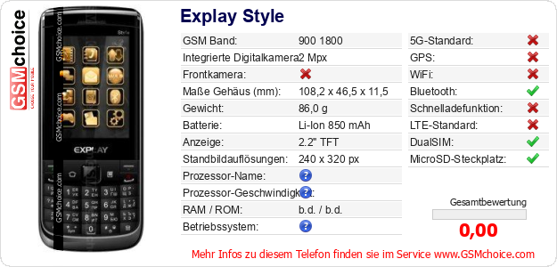 Hast du eigene Webseite? Willst du die Informationen über Standarddaten des Handys Explay Style irgendwo veröffentlichen? Das ist sehr einfach. Du kannst das Bild herunterladen oder kopieren und auf der Webseite folgenden Code hinzufügen:Das Einfügen von diesem Code verursacht das Anzeigen von dem folgenden Bild: