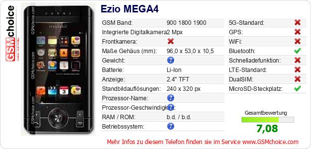 Hast du eigene Webseite? Willst du die Informationen über Standarddaten des Handys Ezio MEGA4 irgendwo veröffentlichen? Das ist sehr einfach. Du kannst das Bild herunterladen oder kopieren und auf der Webseite folgenden Code hinzufügen:Das Einfügen von diesem Code verursacht das Anzeigen von dem folgenden Bild: