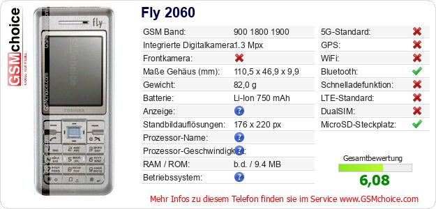 Hast du eigene Webseite? Willst du die Informationen über Standarddaten des Handys Fly 2060 irgendwo veröffentlichen? Das ist sehr einfach. Du kannst das Bild herunterladen oder kopieren und auf der Webseite folgenden Code hinzufügen:Das Einfügen von diesem Code verursacht das Anzeigen von dem folgenden Bild: