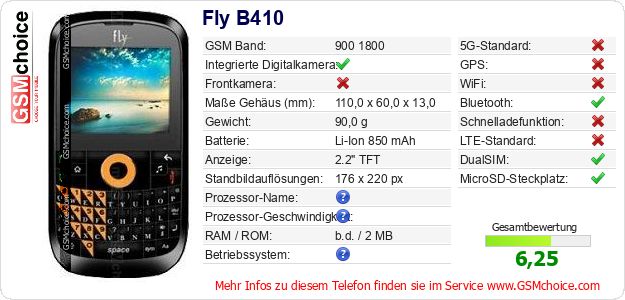 Hast du eigene Webseite? Willst du die Informationen über Standarddaten des Handys Fly B410 irgendwo veröffentlichen? Das ist sehr einfach. Du kannst das Bild herunterladen oder kopieren und auf der Webseite folgenden Code hinzufügen:Das Einfügen von diesem Code verursacht das Anzeigen von dem folgenden Bild: