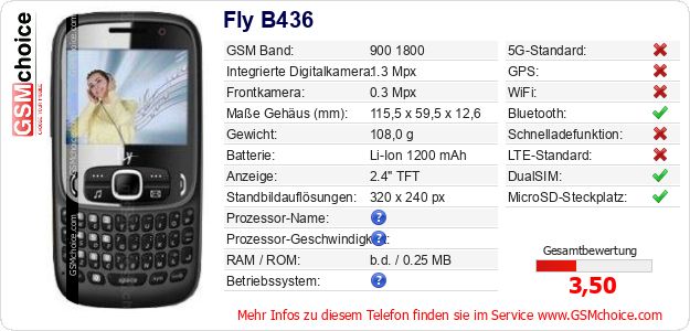Hast du eigene Webseite? Willst du die Informationen über Standarddaten des Handys Fly B436 irgendwo veröffentlichen? Das ist sehr einfach. Du kannst das Bild herunterladen oder kopieren und auf der Webseite folgenden Code hinzufügen:Das Einfügen von diesem Code verursacht das Anzeigen von dem folgenden Bild: