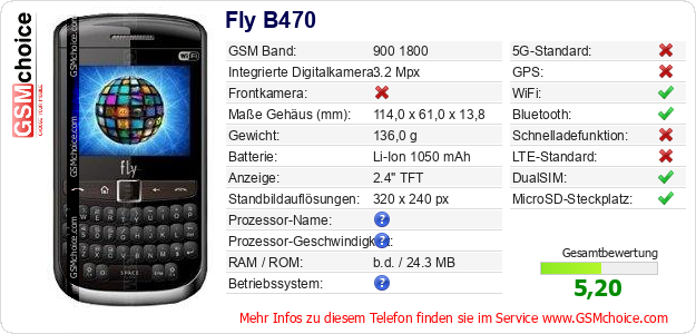 Hast du eigene Webseite? Willst du die Informationen über Standarddaten des Handys Fly B470 irgendwo veröffentlichen? Das ist sehr einfach. Du kannst das Bild herunterladen oder kopieren und auf der Webseite folgenden Code hinzufügen:Das Einfügen von diesem Code verursacht das Anzeigen von dem folgenden Bild: