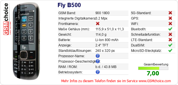 Hast du eigene Webseite? Willst du die Informationen über Standarddaten des Handys Fly B500 irgendwo veröffentlichen? Das ist sehr einfach. Du kannst das Bild herunterladen oder kopieren und auf der Webseite folgenden Code hinzufügen:Das Einfügen von diesem Code verursacht das Anzeigen von dem folgenden Bild: