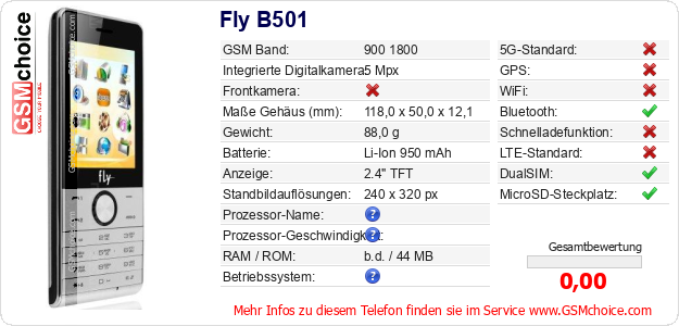 Hast du eigene Webseite? Willst du die Informationen über Standarddaten des Handys Fly B501 irgendwo veröffentlichen? Das ist sehr einfach. Du kannst das Bild herunterladen oder kopieren und auf der Webseite folgenden Code hinzufügen:Das Einfügen von diesem Code verursacht das Anzeigen von dem folgenden Bild: