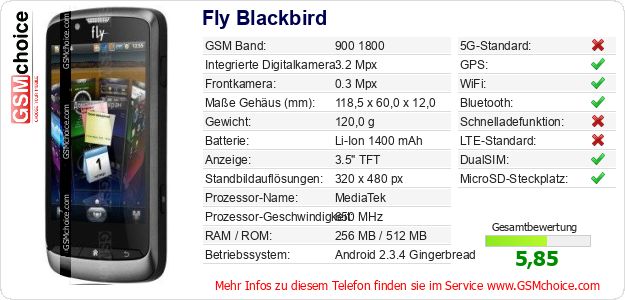 Hast du eigene Webseite? Willst du die Informationen über Standarddaten des Handys Fly Blackbird irgendwo veröffentlichen? Das ist sehr einfach. Du kannst das Bild herunterladen oder kopieren und auf der Webseite folgenden Code hinzufügen:Das Einfügen von diesem Code verursacht das Anzeigen von dem folgenden Bild: