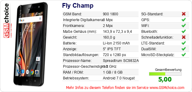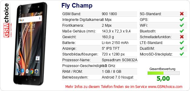 Hast du eigene Webseite? Willst du die Informationen über Standarddaten des Handys Fly Champ irgendwo veröffentlichen? Das ist sehr einfach. Du kannst das Bild herunterladen oder kopieren und auf der Webseite folgenden Code hinzufügen:Das Einfügen von diesem Code verursacht das Anzeigen von dem folgenden Bild: