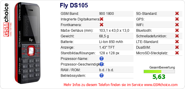 Hast du eigene Webseite? Willst du die Informationen über Standarddaten des Handys Fly DS105 irgendwo veröffentlichen? Das ist sehr einfach. Du kannst das Bild herunterladen oder kopieren und auf der Webseite folgenden Code hinzufügen:Das Einfügen von diesem Code verursacht das Anzeigen von dem folgenden Bild:
