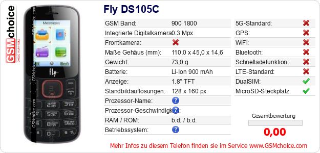 Hast du eigene Webseite? Willst du die Informationen über Standarddaten des Handys Fly DS105C irgendwo veröffentlichen? Das ist sehr einfach. Du kannst das Bild herunterladen oder kopieren und auf der Webseite folgenden Code hinzufügen:Das Einfügen von diesem Code verursacht das Anzeigen von dem folgenden Bild: