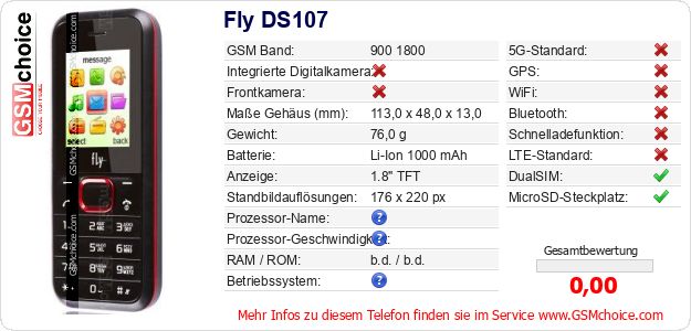 Hast du eigene Webseite? Willst du die Informationen über Standarddaten des Handys Fly DS107 irgendwo veröffentlichen? Das ist sehr einfach. Du kannst das Bild herunterladen oder kopieren und auf der Webseite folgenden Code hinzufügen:Das Einfügen von diesem Code verursacht das Anzeigen von dem folgenden Bild: