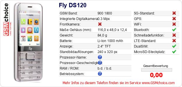 Hast du eigene Webseite? Willst du die Informationen über Standarddaten des Handys Fly DS120 irgendwo veröffentlichen? Das ist sehr einfach. Du kannst das Bild herunterladen oder kopieren und auf der Webseite folgenden Code hinzufügen:Das Einfügen von diesem Code verursacht das Anzeigen von dem folgenden Bild: