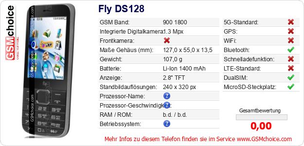 Hast du eigene Webseite? Willst du die Informationen über Standarddaten des Handys Fly DS128 irgendwo veröffentlichen? Das ist sehr einfach. Du kannst das Bild herunterladen oder kopieren und auf der Webseite folgenden Code hinzufügen:Das Einfügen von diesem Code verursacht das Anzeigen von dem folgenden Bild: