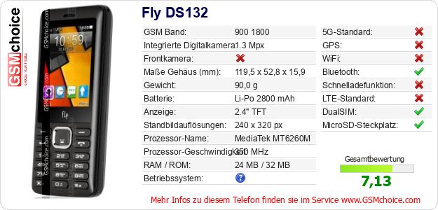 Hast du eigene Webseite? Willst du die Informationen über Standarddaten des Handys Fly DS132 irgendwo veröffentlichen? Das ist sehr einfach. Du kannst das Bild herunterladen oder kopieren und auf der Webseite folgenden Code hinzufügen:Das Einfügen von diesem Code verursacht das Anzeigen von dem folgenden Bild: