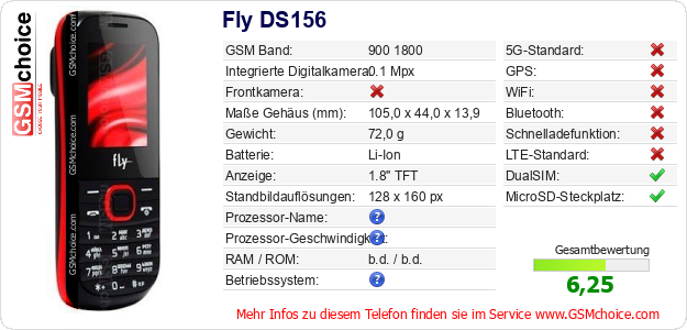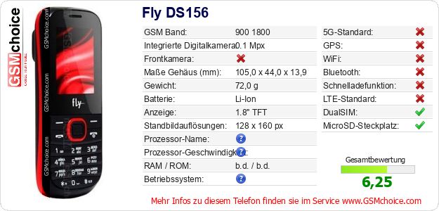 Hast du eigene Webseite? Willst du die Informationen über Standarddaten des Handys Fly DS156 irgendwo veröffentlichen? Das ist sehr einfach. Du kannst das Bild herunterladen oder kopieren und auf der Webseite folgenden Code hinzufügen:Das Einfügen von diesem Code verursacht das Anzeigen von dem folgenden Bild: