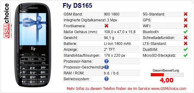 Hast du eigene Webseite? Willst du die Informationen über Standarddaten des Handys Fly DS165 irgendwo veröffentlichen? Das ist sehr einfach. Du kannst das Bild herunterladen oder kopieren und auf der Webseite folgenden Code hinzufügen:Das Einfügen von diesem Code verursacht das Anzeigen von dem folgenden Bild: