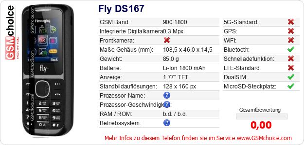 Hast du eigene Webseite? Willst du die Informationen über Standarddaten des Handys Fly DS167 irgendwo veröffentlichen? Das ist sehr einfach. Du kannst das Bild herunterladen oder kopieren und auf der Webseite folgenden Code hinzufügen:Das Einfügen von diesem Code verursacht das Anzeigen von dem folgenden Bild: