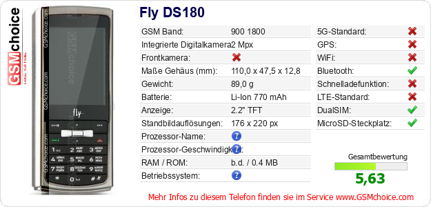 Hast du eigene Webseite? Willst du die Informationen über Standarddaten des Handys Fly DS180 irgendwo veröffentlichen? Das ist sehr einfach. Du kannst das Bild herunterladen oder kopieren und auf der Webseite folgenden Code hinzufügen:Das Einfügen von diesem Code verursacht das Anzeigen von dem folgenden Bild: