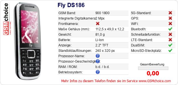 Hast du eigene Webseite? Willst du die Informationen über Standarddaten des Handys Fly DS186 irgendwo veröffentlichen? Das ist sehr einfach. Du kannst das Bild herunterladen oder kopieren und auf der Webseite folgenden Code hinzufügen:Das Einfügen von diesem Code verursacht das Anzeigen von dem folgenden Bild: