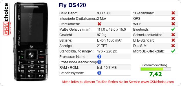 Hast du eigene Webseite? Willst du die Informationen über Standarddaten des Handys Fly DS420 irgendwo veröffentlichen? Das ist sehr einfach. Du kannst das Bild herunterladen oder kopieren und auf der Webseite folgenden Code hinzufügen:Das Einfügen von diesem Code verursacht das Anzeigen von dem folgenden Bild:
