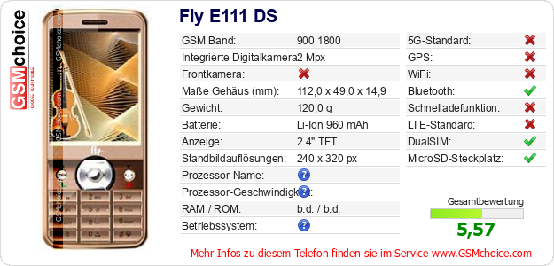 Hast du eigene Webseite? Willst du die Informationen über Standarddaten des Handys Fly E111 DS irgendwo veröffentlichen? Das ist sehr einfach. Du kannst das Bild herunterladen oder kopieren und auf der Webseite folgenden Code hinzufügen:Das Einfügen von diesem Code verursacht das Anzeigen von dem folgenden Bild: